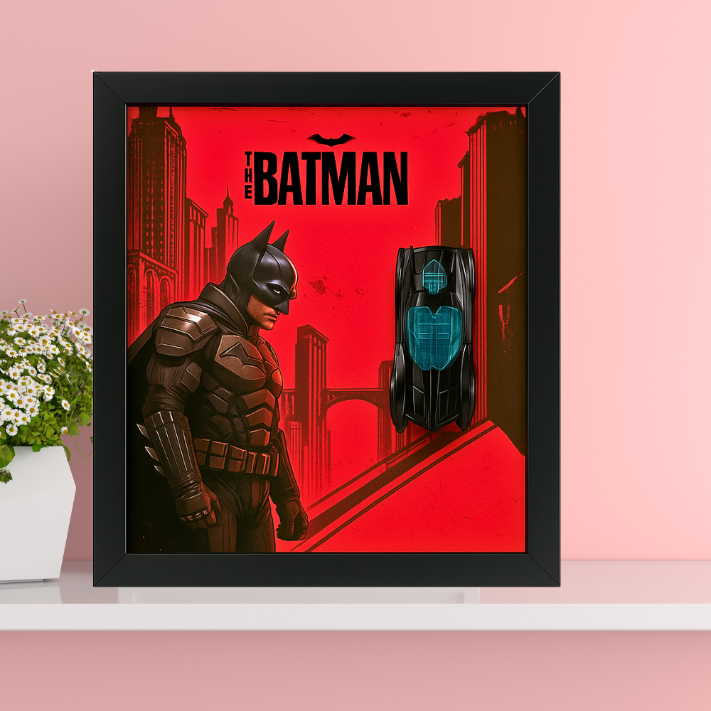 Designed with a dramatic Bat-Signal background and informational print, this compact wall art brings Gotham's most iconic vehicle to life. Whether for a themed bedroom, gaming setup, or office shelf, this Batman display frame adds instant character and collector's appeal. Makes a perfect gift for boys, teens, or superhero lovers of all ages.