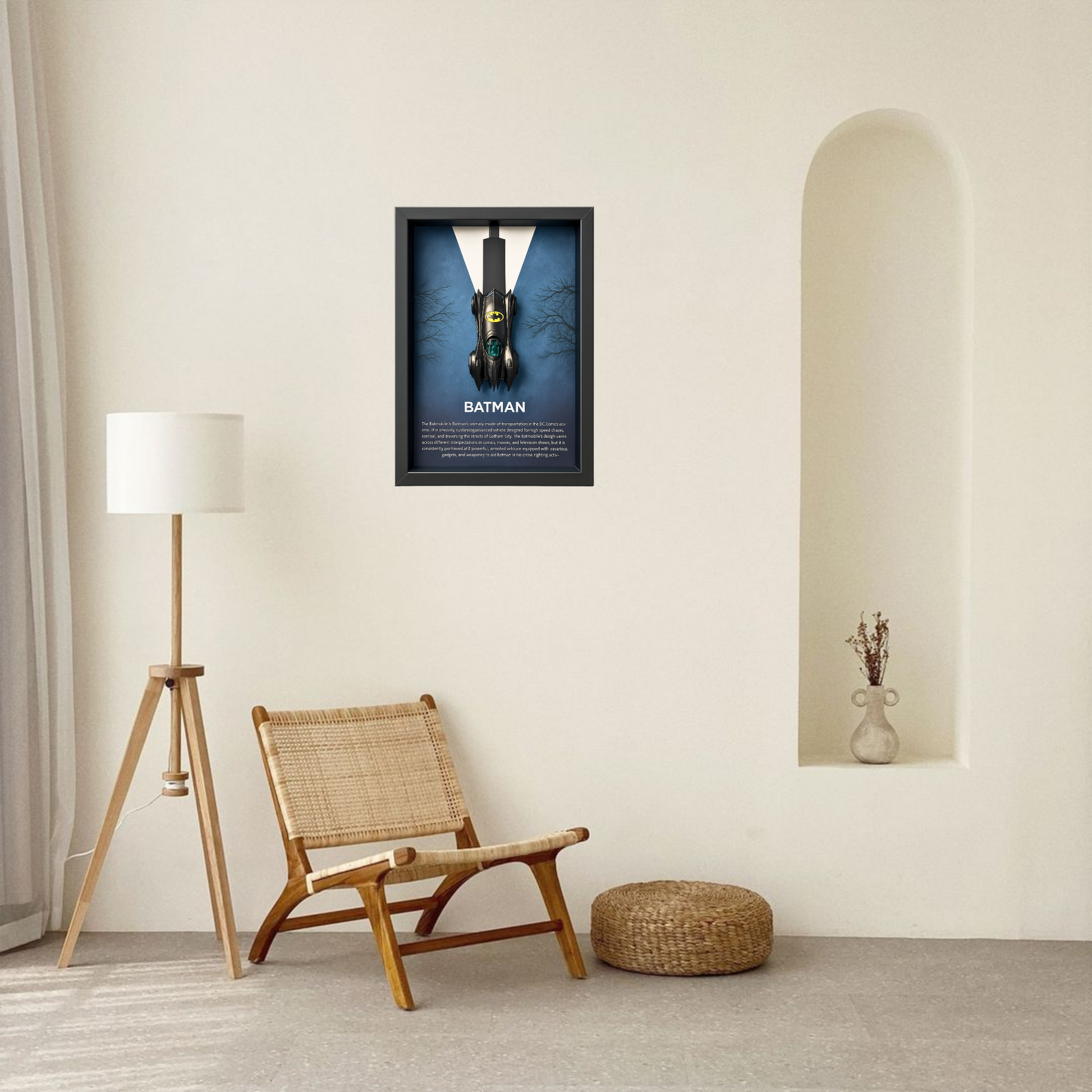 Designed with a dramatic Bat-Signal background and informational print, this compact wall art brings Gotham's most iconic vehicle to life. Whether for a themed bedroom, gaming setup, or office shelf, this Batman display frame adds instant character and collector's appeal. Makes a perfect gift for boys, teens, or superhero lovers of all ages.