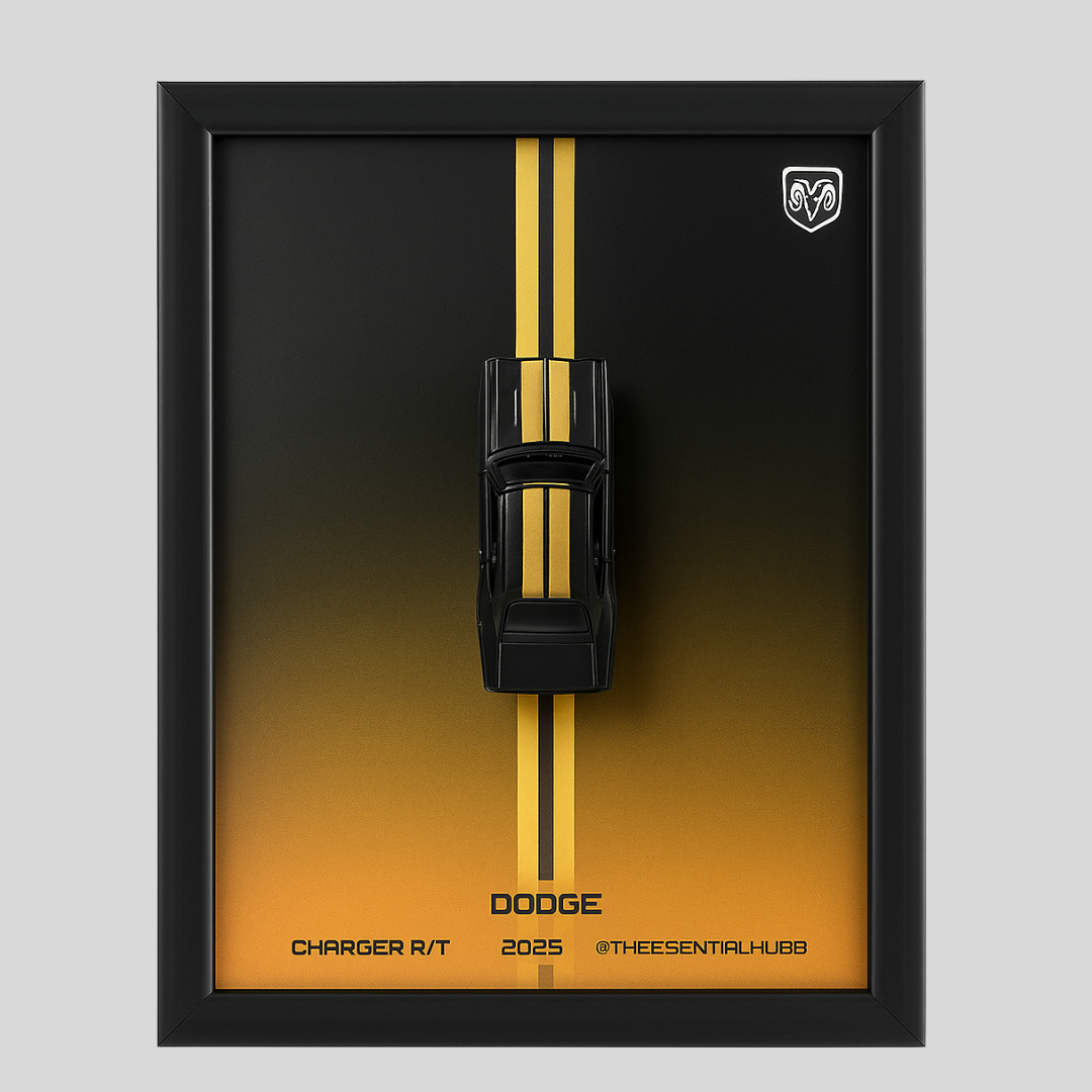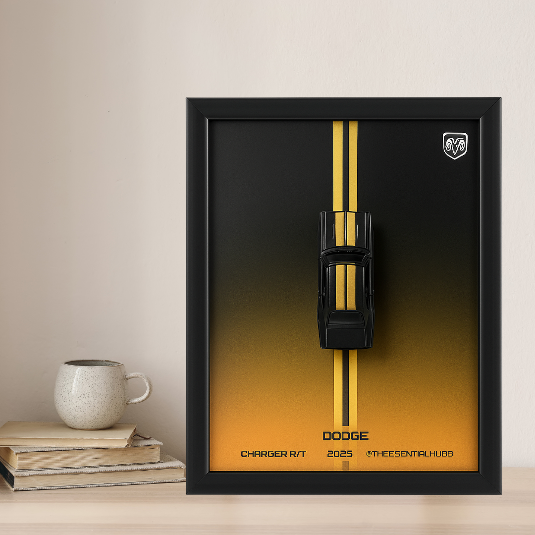 Unleash raw American muscle with our Dodge Charger R/T 3D Frame – a tribute to the boldness of classic power and iconic street presence. Featuring a perfectly scaled die-cast model mounted on a premium matte background with striking yellow racing stripes, this frame captures the spirit of the legendary R/T series.