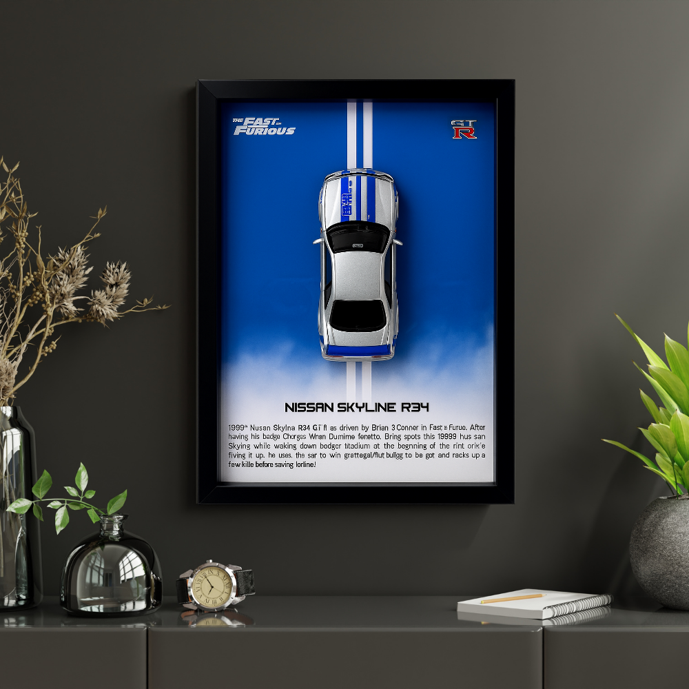 Fast & Furious Nissan Skyline R34 GT-R Diecast Car Frame 1:32 – 3D Wall Art for Collectors & Movie Fans