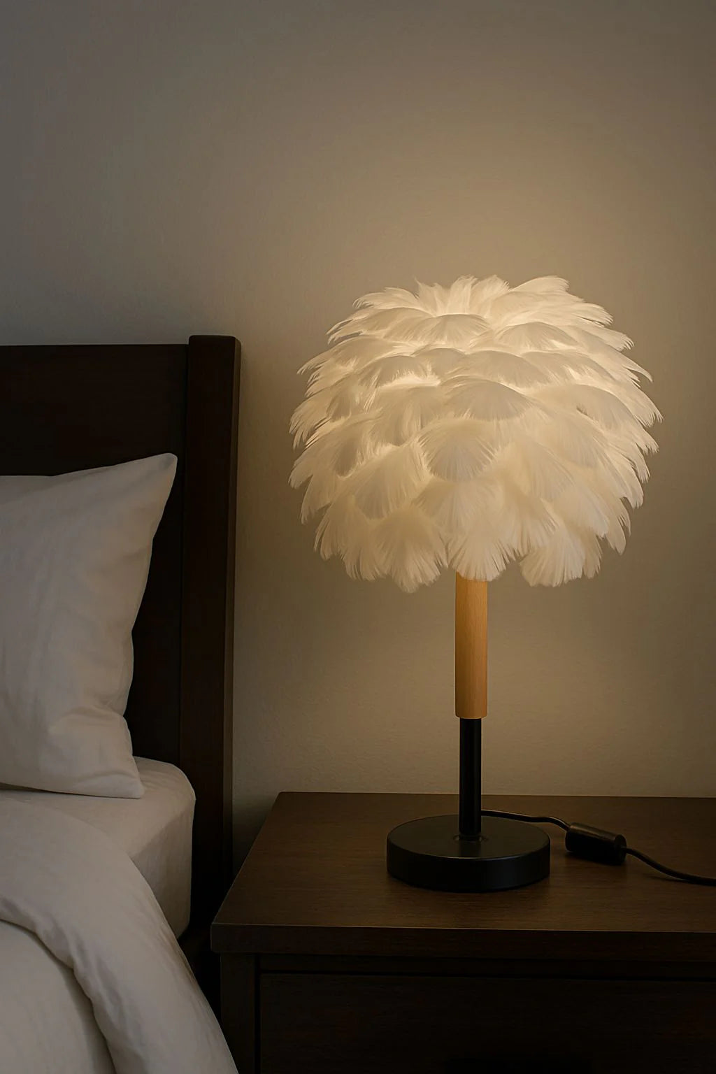 Crafted from high-quality faux feathers, a sturdy metal frame, and wooden accents, this lamp combines natural elegance with modern style.