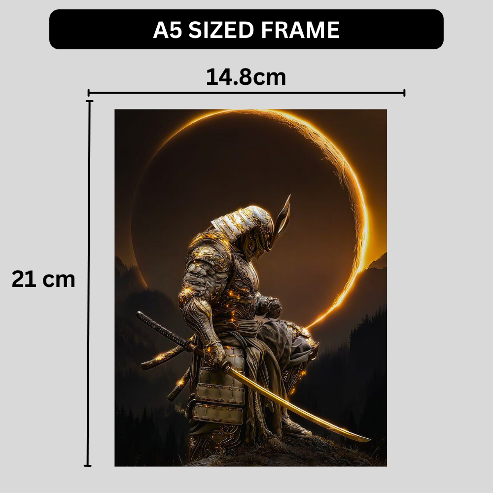 Elevate your space with this Golden Samurai Warrior poster, a striking piece of wall art inspired by the honor, strength, and discipline of ancient Japanese warriors. Featuring a heavily armored samurai kneeling beneath a glowing eclipse, this artwork blends dark fantasy with cinematic realism.