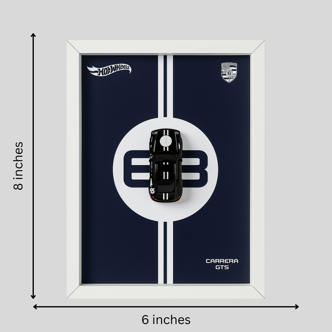 This sleek Porsche Carrera GTS Hot Wheels car is carefully mounted in a black 3D shadow box, giving it a floating, gallery-style look. Whether you're decking out your home, office, or gaming setup, this frame adds a bold yet classy automotive touch to any space.