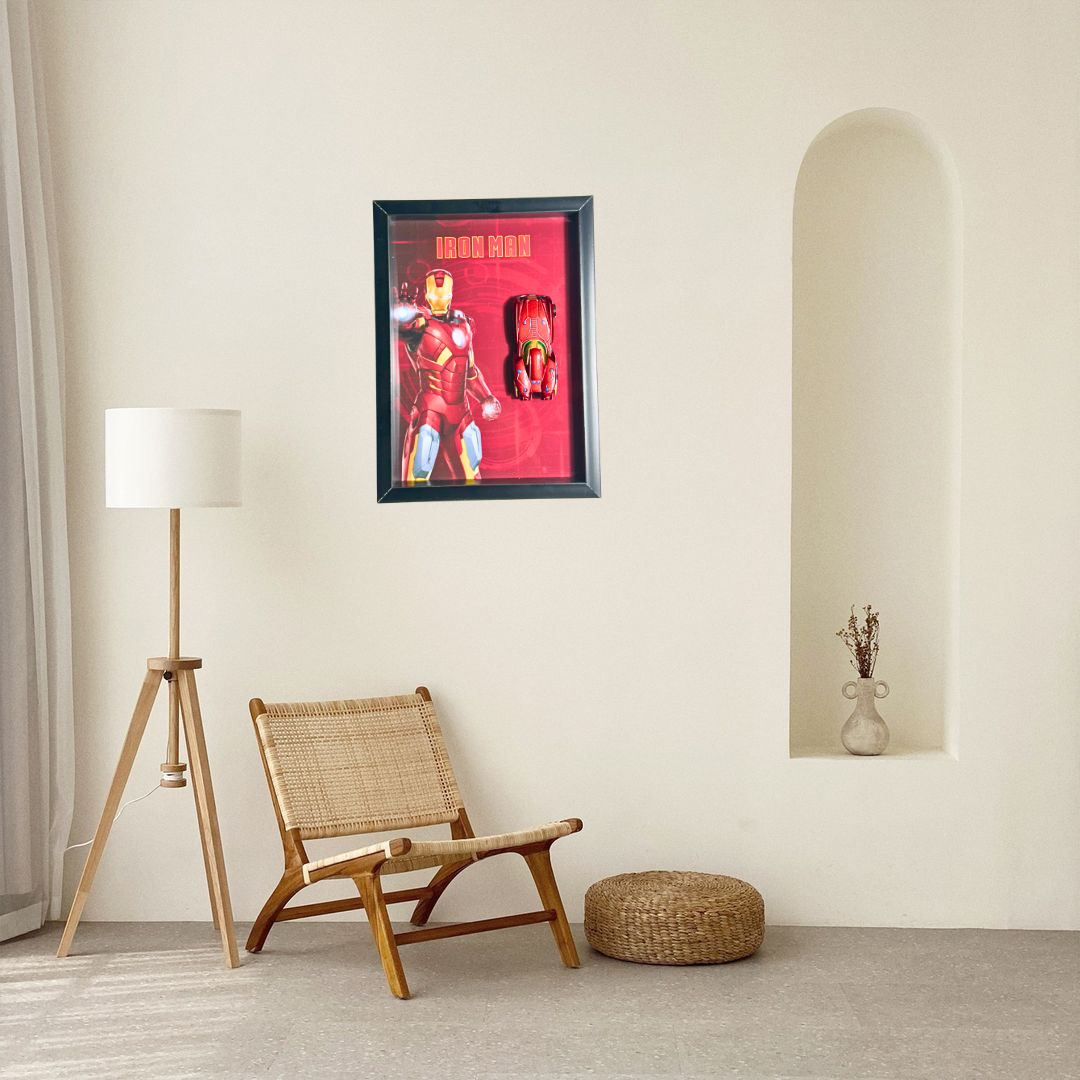 Bring the power of Tony Stark to your space with this Iron Man Diecast Car Frame, featuring a vibrant red superhero-themed background and a sleek Iron Man-inspired miniature car. This collectible is beautifully set in a premium black frame, making it a perfect choice for Marvel fans, kids’ rooms, superhero lovers, or pop culture collectors.