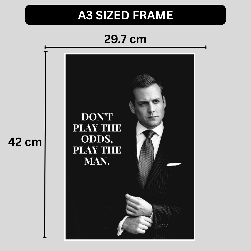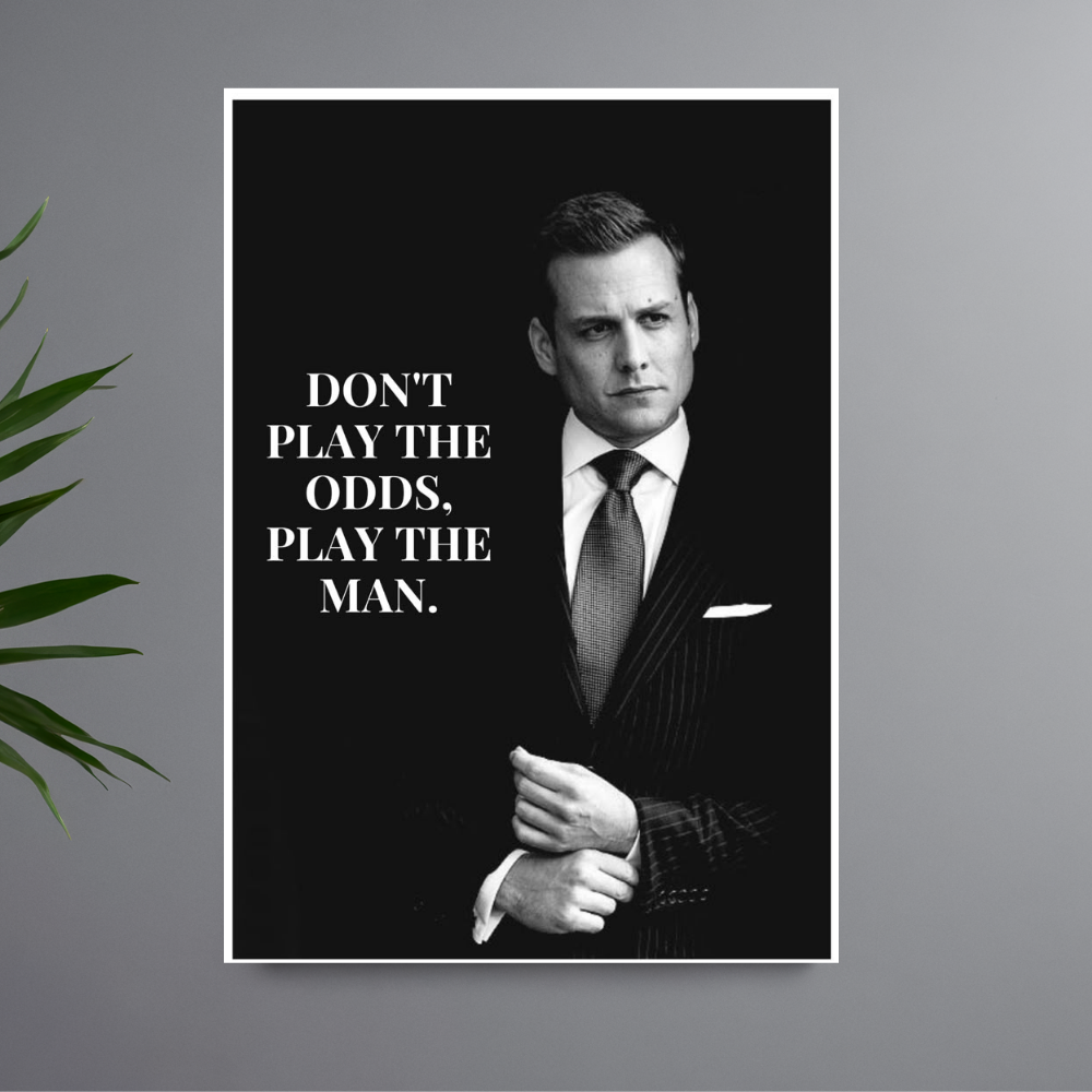 Make a bold statement with Play the Man, a luxury black and white motivational quote wall art poster designed for powerful interiors and confident minds. Featuring a timeless monochrome portrait paired with the iconic quote “Don’t play the odds, play the man,” this poster represents confidence, strategy, and leadership.