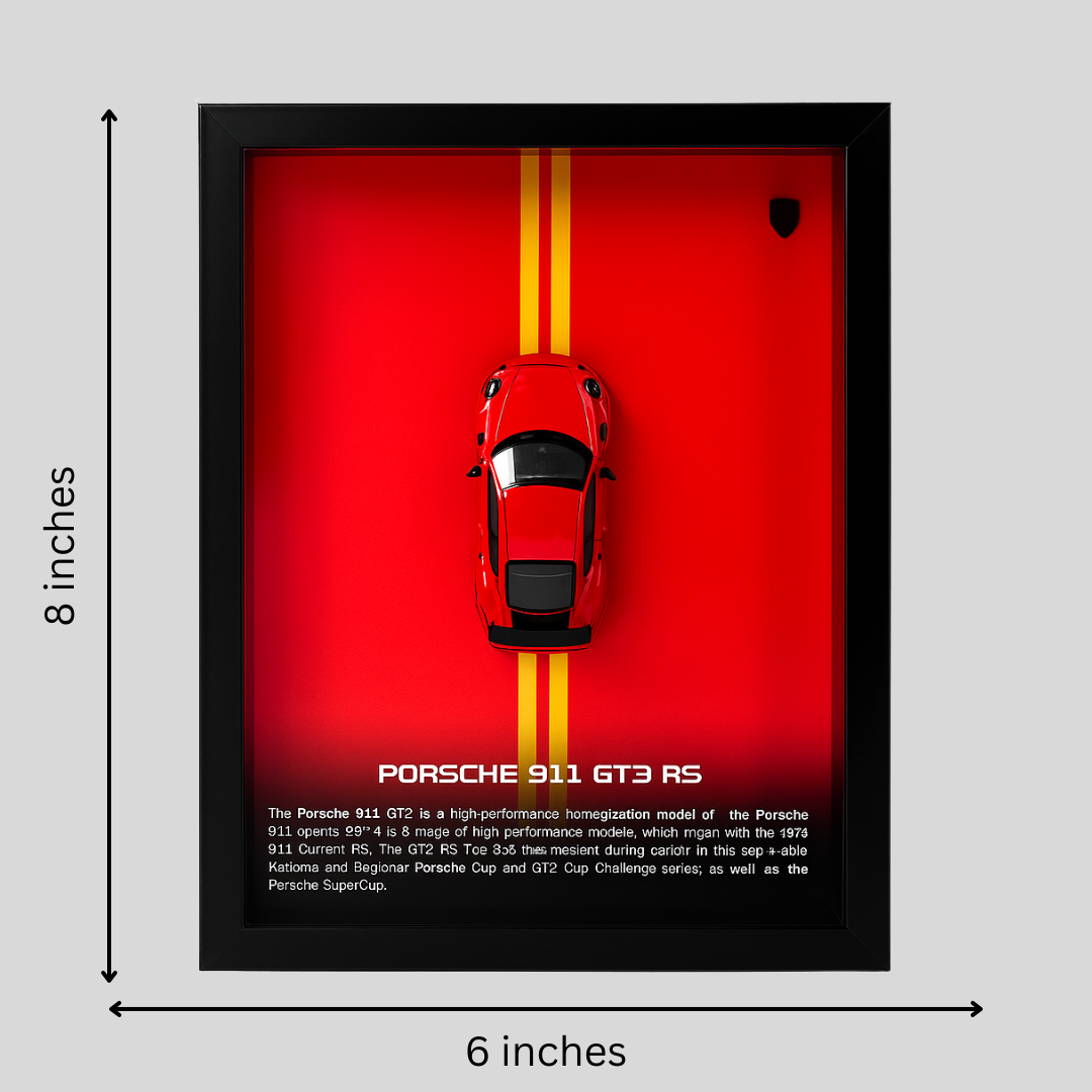 Show off your love for speed and luxury with this sleek 3D Porsche 911 GT3 RS car frame. Perfect for car enthusiasts, this stylish frame features a detailed miniature of the iconic supercar set against a premium background — making it a great addition to desks, shelves, or wall decor.