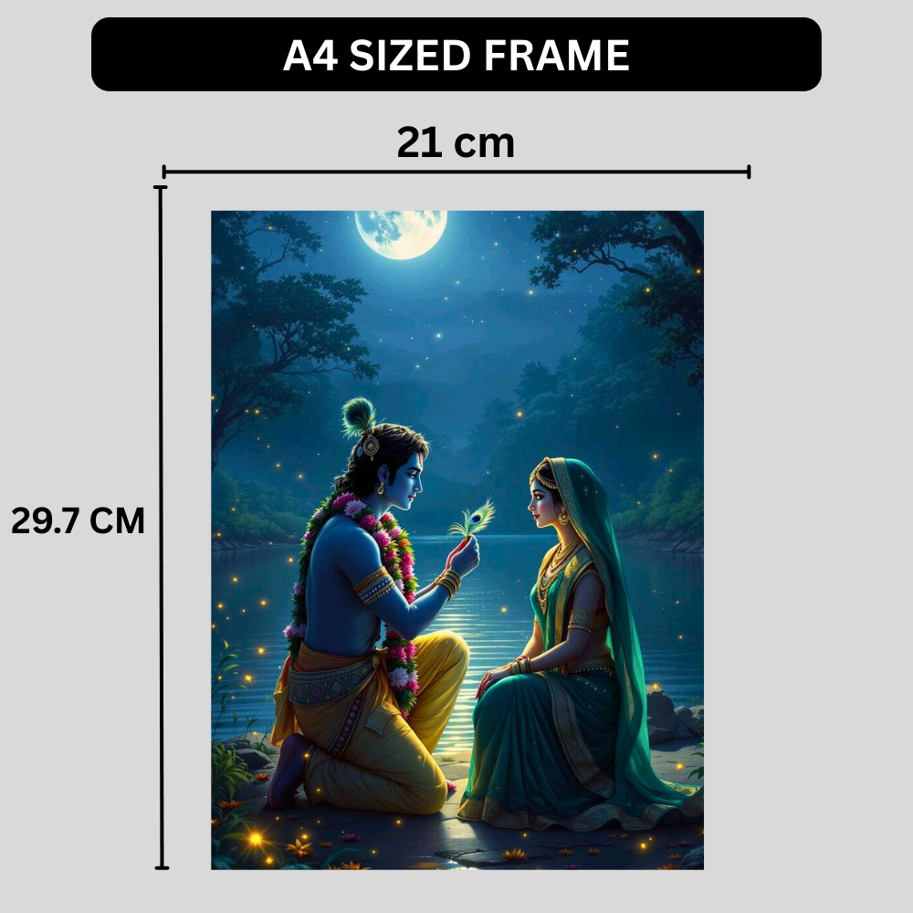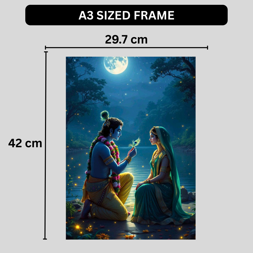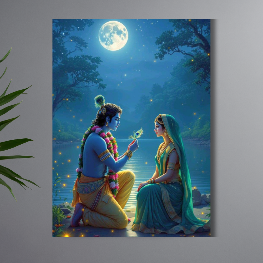 Radha Krishna Moonlight Poster | Lord Krishna & Radha Romantic Wall Art | Spiritual Hindu Devotional Poster for Home, Mandir & Bedroom | Premium Glossy Print