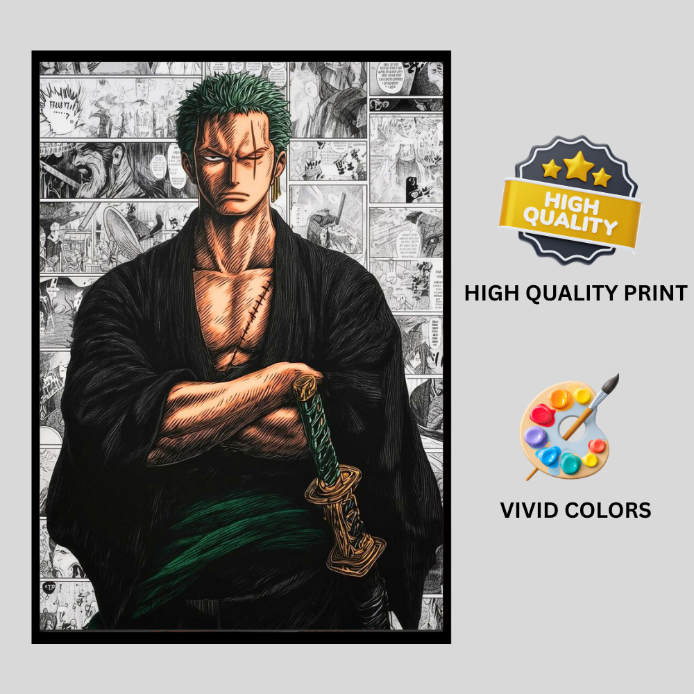 Roronoa Zoro 2D Glossy HD Wall Frame | One Piece Anime Samurai Artwork | Manga Collage Poster | Premium Gloss Finish Wall Decor for Anime Fans