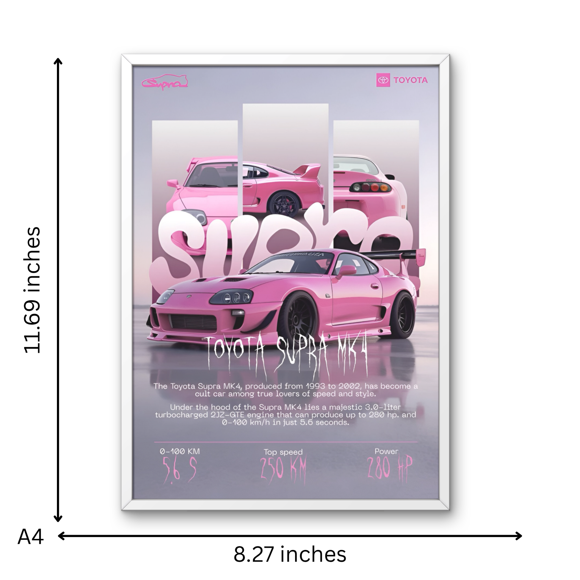 Bring your passion for cars to life with our Supra A4 Framed Car Wall Art, the perfect blend of style, quality, and speed-inspired design. Each piece comes professionally framed and ready to hang, featuring iconic cars—from JDM legends to supercar beasts and vintage classics.