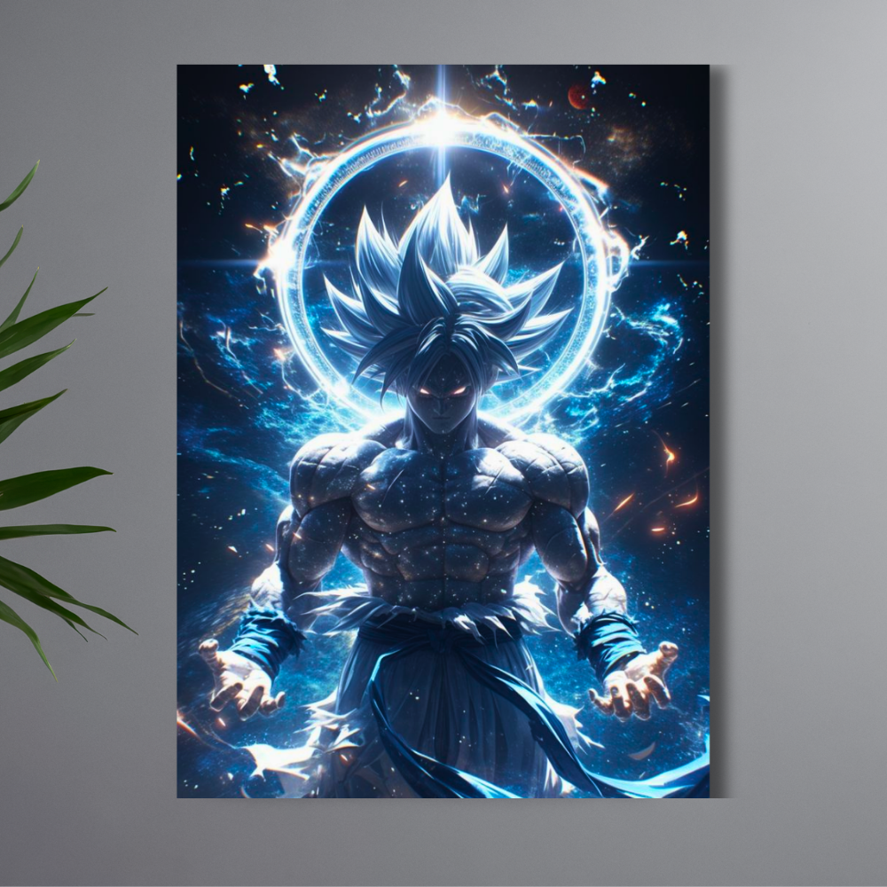 Ultra Instinct Goku Artwork – Powerful anime poster featuring Goku in Ultra Instinct form from Dragon Ball Super, showcasing intense energy and iconic anime visuals.
